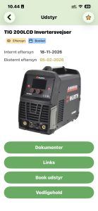 Adgang til dokumenter og links (f.eks. brugsvejledninger og vedligeholdelsesrapporter)- Visning af status på udstyr via tags (overskredet eftersyn, booket, defekt)